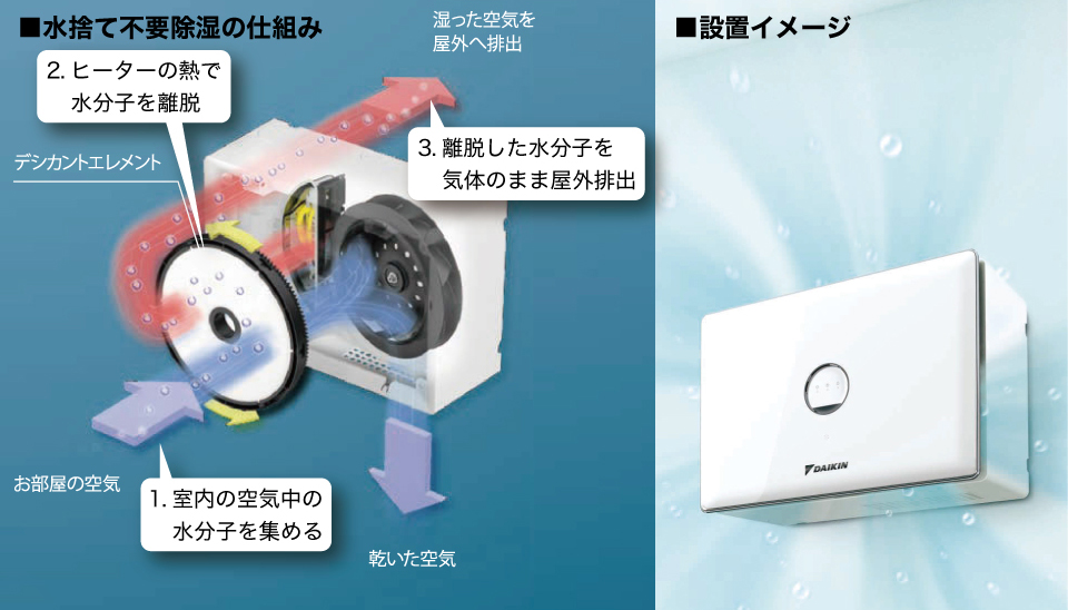 デシカント方式とは、室内の空気中に含まれる水分を、デシカントエレメントに吸着させ、高湿度の空気として屋外に気体のまま放出する方式です。