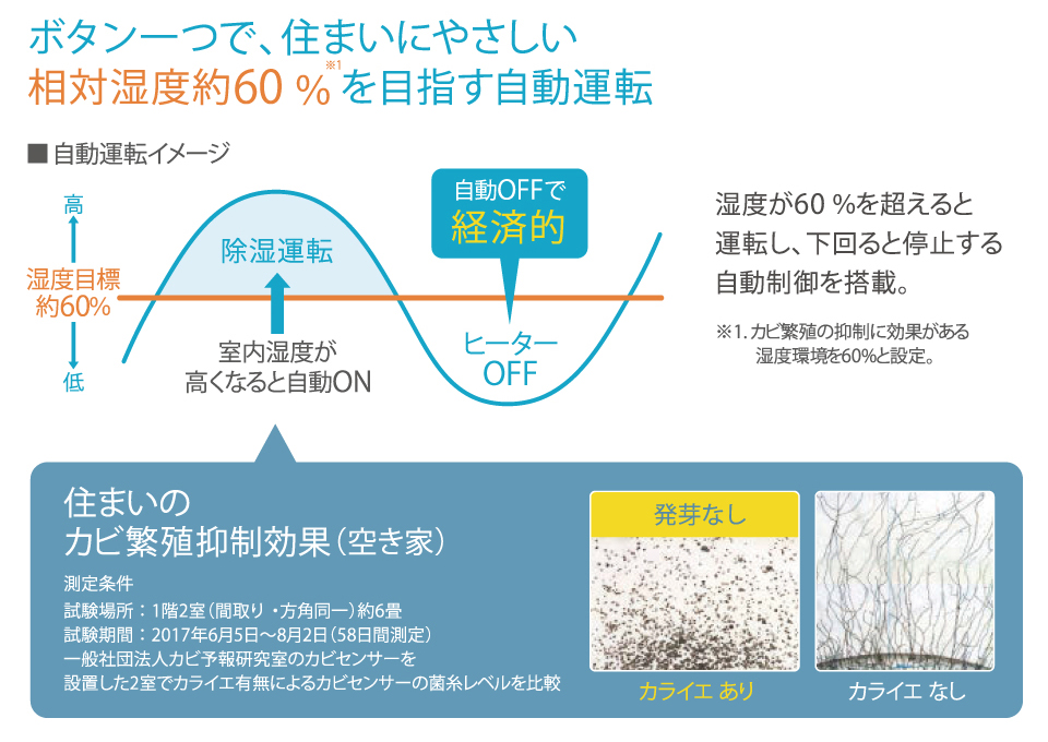 室内の湿度を約60%に保つ自動運転搭載だからとっても経済的!最近は電気代の高騰もあり電気代をきにされるお客様も多いですが、カライエならつけっぱなしでも安心!カビが繁殖し、高額なリフォームをする心配からボタン一つで解消されます。
